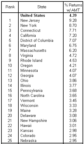 - State and local taxes are are the lion’s share of the disallowed preference items — almost 2/3’s — which is why high tax rate states (NJ, NY, CT, CA, DC, MS, MA — see table below) have the highest percentage of filers getting hit with the AMT.