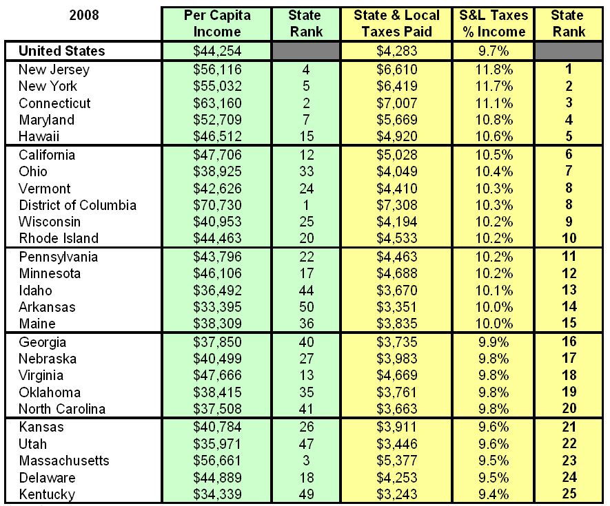 Well, based on data from the Tax Foundation, it’s really the rich folks living in NJ (and NY, CT, MD, and HI) that have the problem: they pay the highest state and local taxes in the country — a point or two higher than the national average 9.7%.