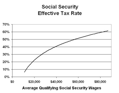 The answer: low wage earners pay practically nothing for their benefits — their contributions are simply a forced saving for their retirement benefits. High earners get relatively little of their contributions back — in effect, paying a tax rate over 60%