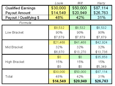 Low-earning Louie earned an inflation adjusted average of $30,000 and mid-earning Milt earned an inflation adjusted average of $50,000. So, their respective calculated initial annual benefits are $14,549 (which works out to be 48% of $30,000) and $20,949 (42% of $50,000). High-earning Harry only got 31% of his inflation adjusted average wages in annual benefits.