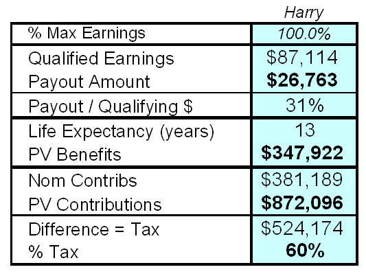 Also assume that Harry has been working since age 25, that he earned precisely the maximum taxable base earnings each year (i.e. the year-by-year equivalent of 2008’s $102,000 wage cap), and that he and his employer both paid the applicable Social Security rates each year on those earnings.
