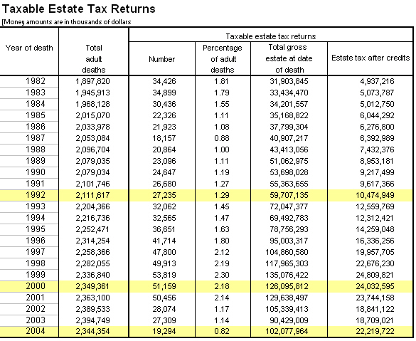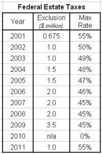 Under the Bush Tax Plan, estate taxes were cleverly rebranded “death taxes” and have been phasing towards full repeal (zero federal estate taxes) in 2010.