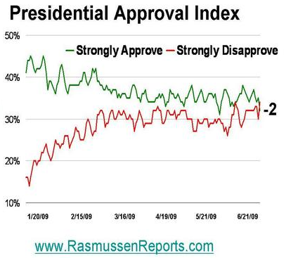 But, the Rasmussen Reports daily Presidential Tracking Poll for Sunday showed that 32% of the nation’s voters now Strongly Approve of the way that Barack Obama is performing his role as President … 34% Strongly Disapprove giving Obama a Presidential Approval Index rating of -2.