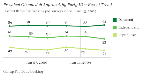 President Barack Obama’s job approval rating fell to 58% in Gallup Poll Daily tracking from June 16-18 — a new low for Obama in Gallup tracking. In the past couple of weeks, Dem approval has remained unshakable; GOP has fallen by 8 points; Independent support has fallen by a whopping 11 points.