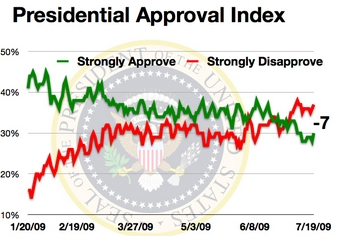 I usually cite the Rasmussen poll numbers.  For the record, they now show Obama running a negative PAI (Presidential Approval Index).  That is, more people strongly disapprove of the job he’s doung as president than strongly approve.  In prior posts, I’ve argued why that’s a better indicator than the groos approval numbers usually reported in mainstream media, and I’ve highlighted the demographics (e.g. rock solid among blacks; double digit negative among whites).