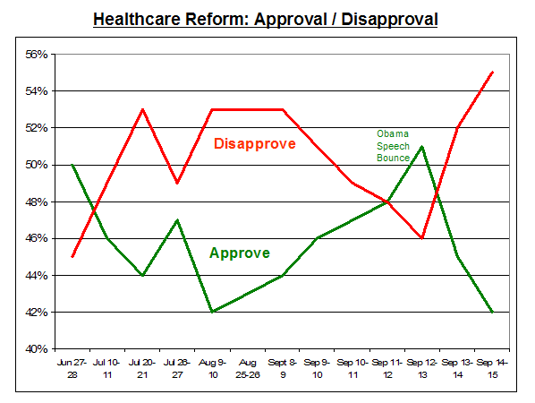 One week after President Obama’s speech to Congress, opposition to his health care reform plan has reached a new high of 55%.