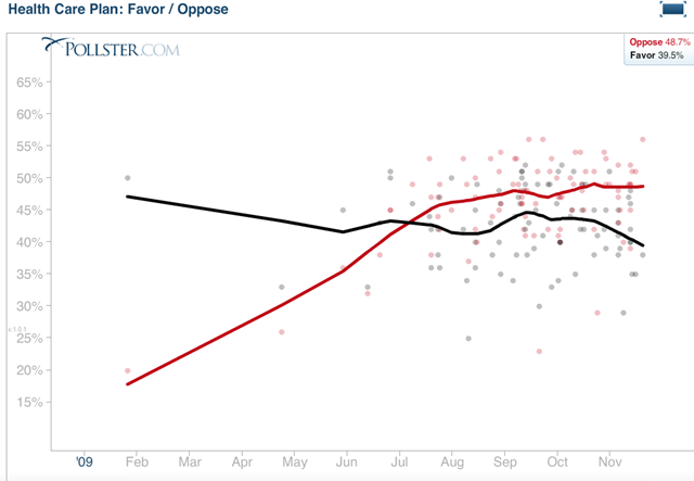 Based on Pollster.com’s “poll of polls”, almost half the country opposes the proposed healthcare plan(s) … and fewer than 4 in 10 folks favor it (or “them”).