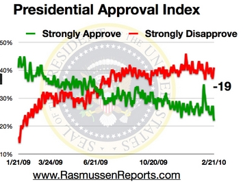 The Rasmussen Reports daily Presidential Tracking Poll for Sunday February 21 shows that 22% of the nation’s voters Strongly Approve of the way that Barack Obama is performing his role as President. That is the lowest level of strong approval yet recorded for this President.