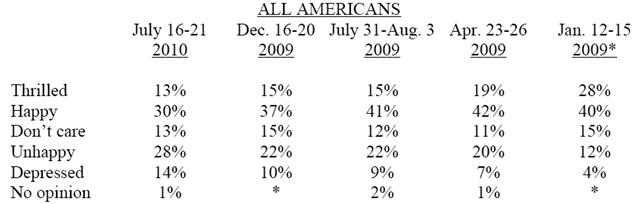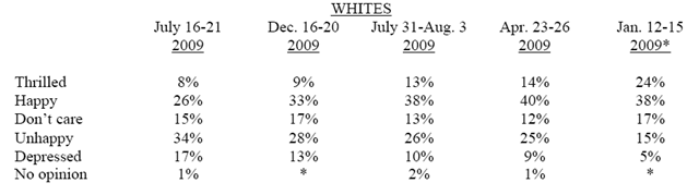 Among all Americans, more are depressed that Obama is President than are thrilled – 14% (up from 4%) to 13% (down from 28%)
