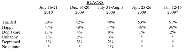 Among blacks, 39% are thrilled … down from 61% on Inauguration Day.