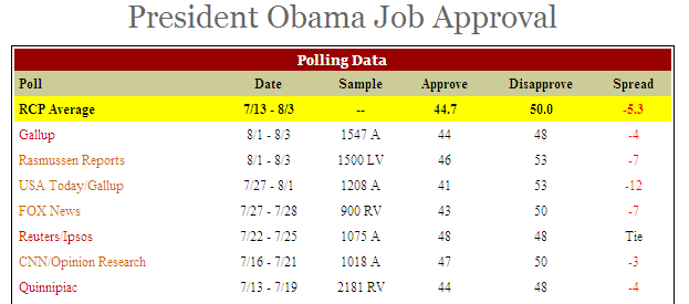 For the first time a majority in the Real Clear Politics poll-of-polls disapprove of the way President Obama is handling his job.