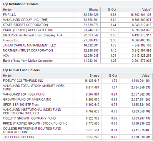 Point 2: A whopping 71% of Apple’s stock is owned by institutions. That compares to 52% for GE and 49% for Exxon Mobil. Fidelity & Vanguard own almost 10% of Apple’s stock. Five institutions – adding State Street, TRP and Blackrock – push the number to almost 20%.