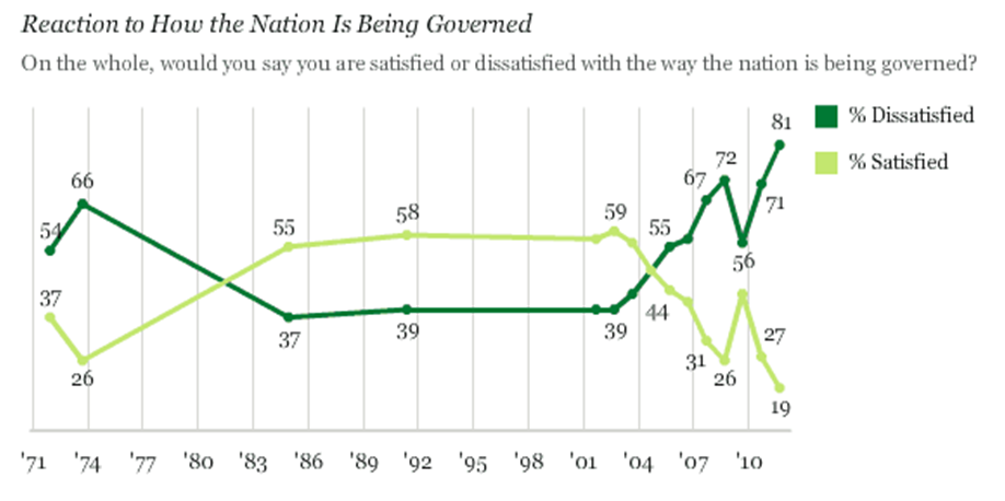 Punch line: According to Gallup a record-high 81% of Americans are dissatisfied with the way the country is being governed