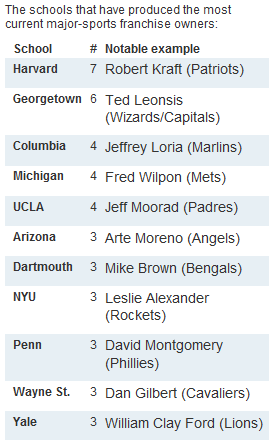 Five owners earned their undergraduate degrees there, including embattled Los Angeles Dodgers owner Frank McCourt and Washington’s Ted Leonsis, who owns the Wizards and Capitals.