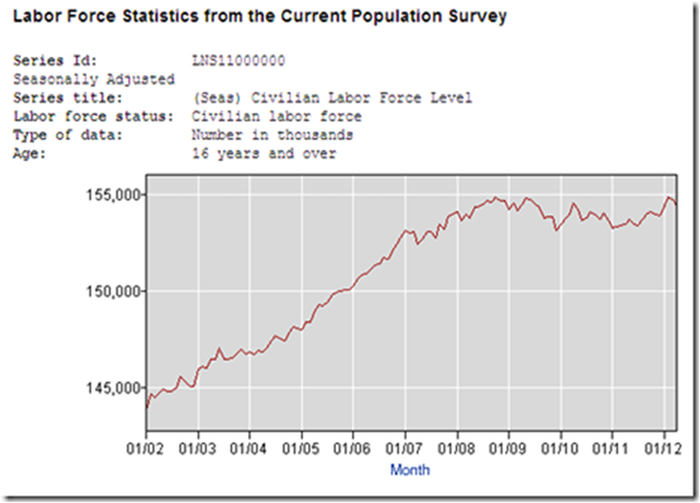 If the labor force participation rate had stayed constant from January 2009 until now, there would be 159,522.672 folks in the labor force … not the currently reported 154,365,000
