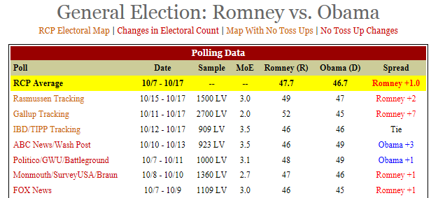 RealClearPolitics poll-of-polls had Romney up by a point at 47.7%