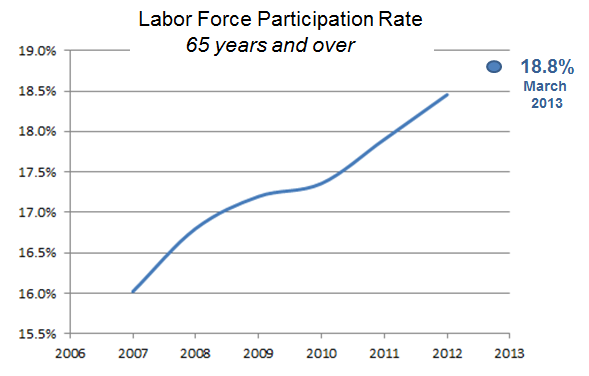 First, interestingly, labor force participation among folks 65 and over has been increasing for a couple of years … and is continuing to increase.