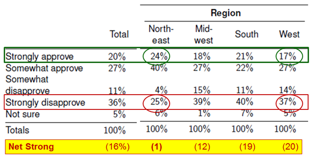 But … looking at the “top & bottom boxes – strongly approve, strongly disapprove – he underwater by 16 percentage points.