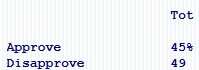 According to this weeks Quinnipiac University National Poll, the President’s approval rating has dipped to 45% … putting him underwater against a 49% disapproval rating,