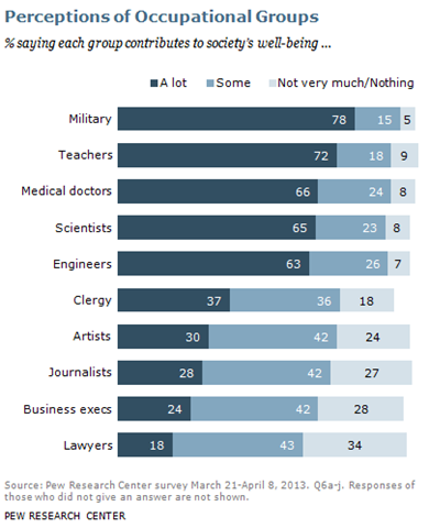Lawyers and business execs contribute the least … with less than 1 in 5 people perceiving that lawyers contribute to society’s well-being.
