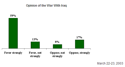 Support increased to 66% after President Bush made his “ultimatum” speech in which he pledged military action if Saddam Hussein did not leave Iraq, and jumped as high as 76% on [rior to the start of the military action.