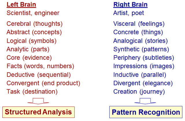 Key is recognizing that the characteristics of the brain sides consolidate into two fundamental problem solving skills: pattern recognition and structured analysis.