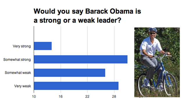 45% said that Obama was a strong leader …  but only 14%  rated him “very strong”.