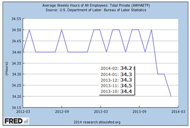 The punch line: “Hours worked are declining, resulting in the equivalent of a net loss of 100,000 jobs since September.”