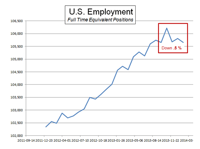 Note that when employment is restated into FTEs, you get a different answer: the labor force is shrinking, not growing.