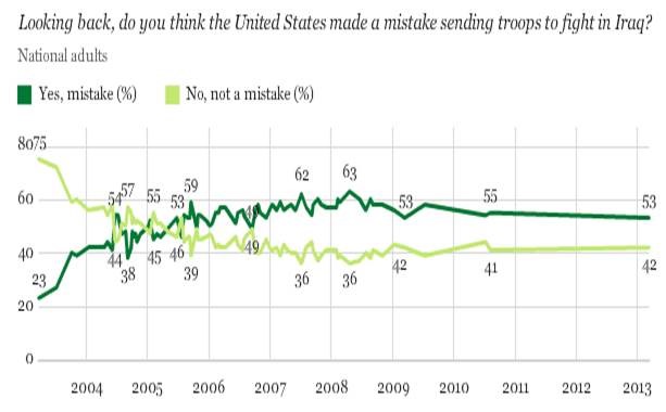 According to Pew polls, over 70% of U.S. citizens initially thought that invading Iraq was the right decision.