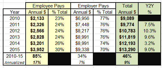 First, the total annual policy premium – the sum of my contributions and my employers – increased by over $4,000 over the past 5 years …. That’s a 46% increase … an average annualized increase of 9% over the past 5 years.
