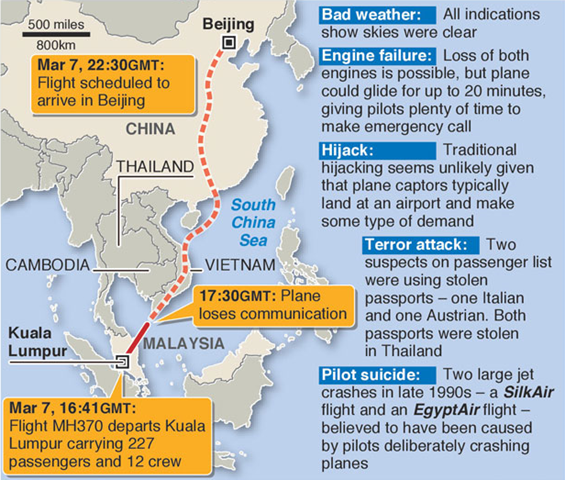 My friend’s theory: The pilot wanted to “disappear” … so he knocked out the co-pilot, took the plane to 45,000 feet to disable the passengers, set the auto-pilot for the Indian Ocean route, took the plane down to 20,000 feet, then jumped out over Malaysia (after the plane made its u-turn.