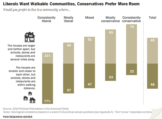 If they could choose anywhere to live, three-quarters of consistent conservatives prefer a community where “the houses are larger and farther apart, but schools, stores, and restaurants are several miles away.”