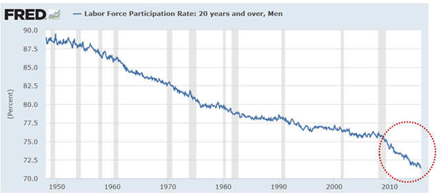 Since the 2008 financial crisis and the LFPR has dropped around 4 percentage points … not quite half of the 1965 to 1990 gain.
