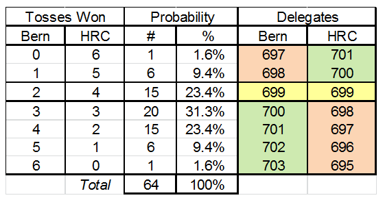 - 703 to 695 if Hillary had lost all tosses (1.6% – the same as her winning all 6 tosses)