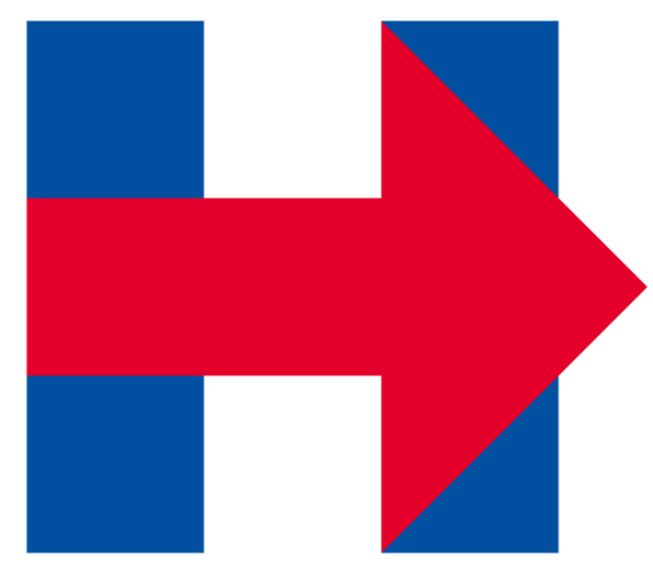 Clinton’s logo is a big “H” with an arrow pointing forward.