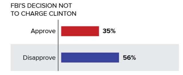 Specifically, 54% of likely U.S. voters disagree with the FBI’s decision and believe that the FBI should have sought a criminal indictment of Clinton … 27% agree with Comey and 10%) are undecided.