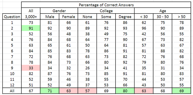 The more than 3,000 benchmark quiz-takers answered 67% of the questions correctly.