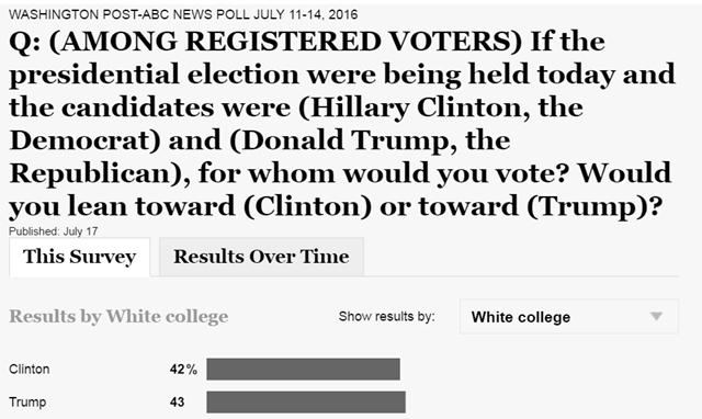Donald and Hillary are statistically tied among the “white college degree” folks … in fact, Trump edges Clinton 43 to 42 in the raw data.