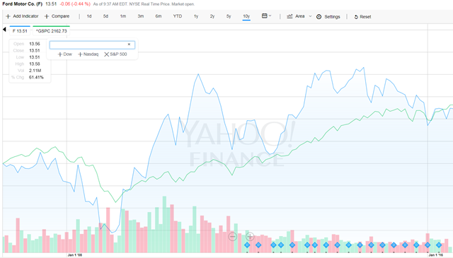 Simple answer: At par with the S&P 500 when measured from pre-financial crisis levels … better than the S&P if measured from the financial crisis trough. (Ford is the thin green line on the chart, S&P is the blue).