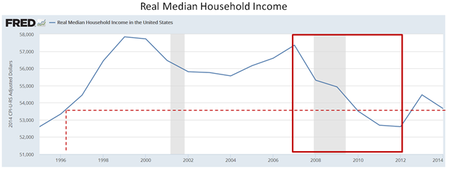 As is often headlined, real median household income is now (in 2016) where it was roughly 20 years ago (in 1996).