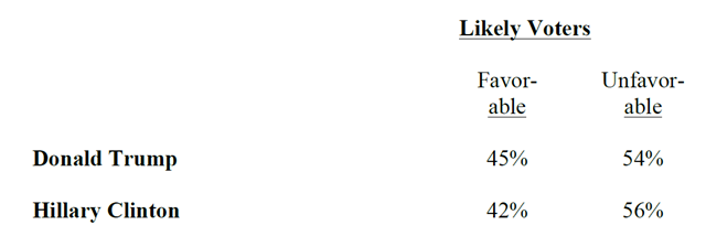 A majority stills views each of the candidates unfavorably … Trump’s unfavorability is down a tad, Hillary’s a up a click.