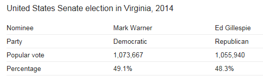 But, the most recent results brought to mind the 2014 Senate race between incumbent Democrat Mark Warner and former RNC head Ed Gillespie.