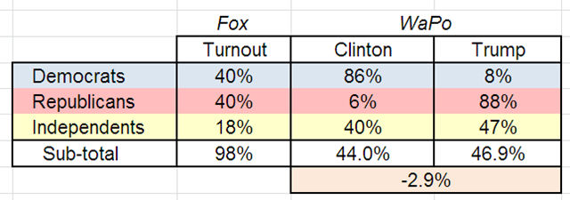 Let’s start by using the WaPo turnout assumptions (37%, 30%, 29%) … and the Fox party-affiliated voter preferences: Hillary gets 90% of the Dem vote, Trump gets 85% of the GOP vote.