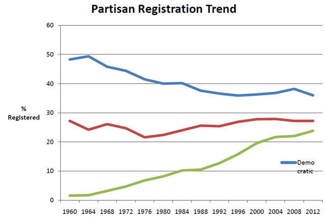 Similarly, GOP registrations have been relatively constant since 2000 at roughly 28%.
