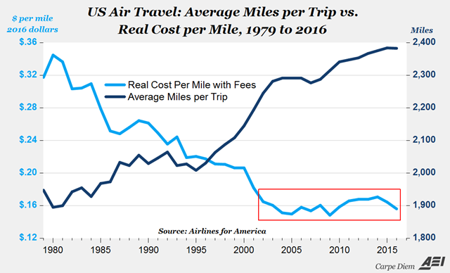 For openers, according to an analysis charted by AEI, “real” airfares – adjusted for inflation – dropped substantially when the industry was deregulated … and, fares have only started to bounce back over the past couple of years.