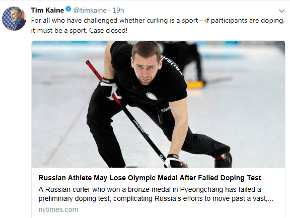 For example, Hillary’s former running mate – Sen. Tim Kaine – tweeted that “if participants are doping, then it must be a sport”.
