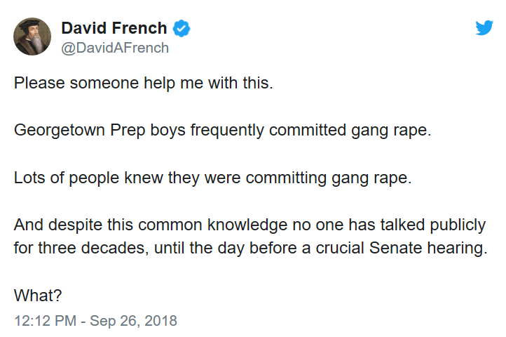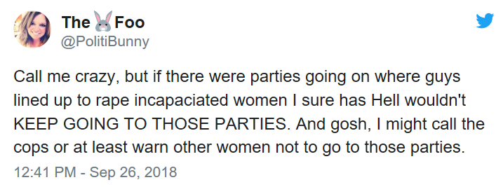 In a nutshell the accuser – who reportedly holds a security clearance and contracts on-and-off with the government – says that circa 1981, Kavenaugh (and buddy Mark Judge) spiked party punch bowls causing women to become inebriated and vulnerable to subsequent gang rapes.
