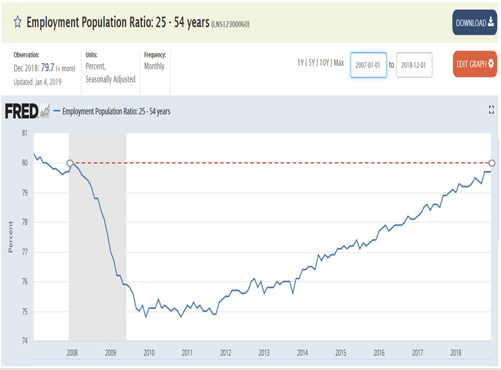 The employment-to-population ratio among working age adults rounds to 80% … the all time high water mark.