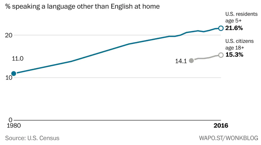 According to a WaPo analysis of Census Dept. data, about 1 in 5 U.S. households don’t speak English at home.